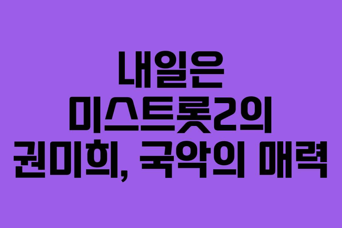 내일 방송될 미스트롯2에 출연하는 권미희님은 국악가수로 많은 사랑을 받고 있습니다. 그녀는 다양한 경연 프로그램에서 실력을 인정받으며, 특히 “너의 목소리가 보여”와 “보이스 코리아 2020″에 출연한 경험이 있습니다.