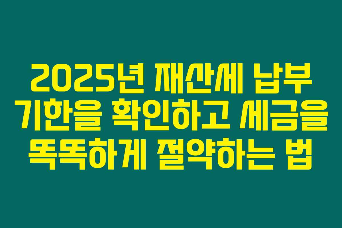 2025년 재산세 납부 기한을 미리 확인하고 절세 방법을 활용해 부담을 줄일 수 있음을 강조하고 싶어요. 재산세는 매년 정해진 기한에 꾸준히 납부해야 하는 만큼 기한을 놓치지 않을 수 있도록 주의하고, 적절한 꿀팁으로 절세를 더해보세요!