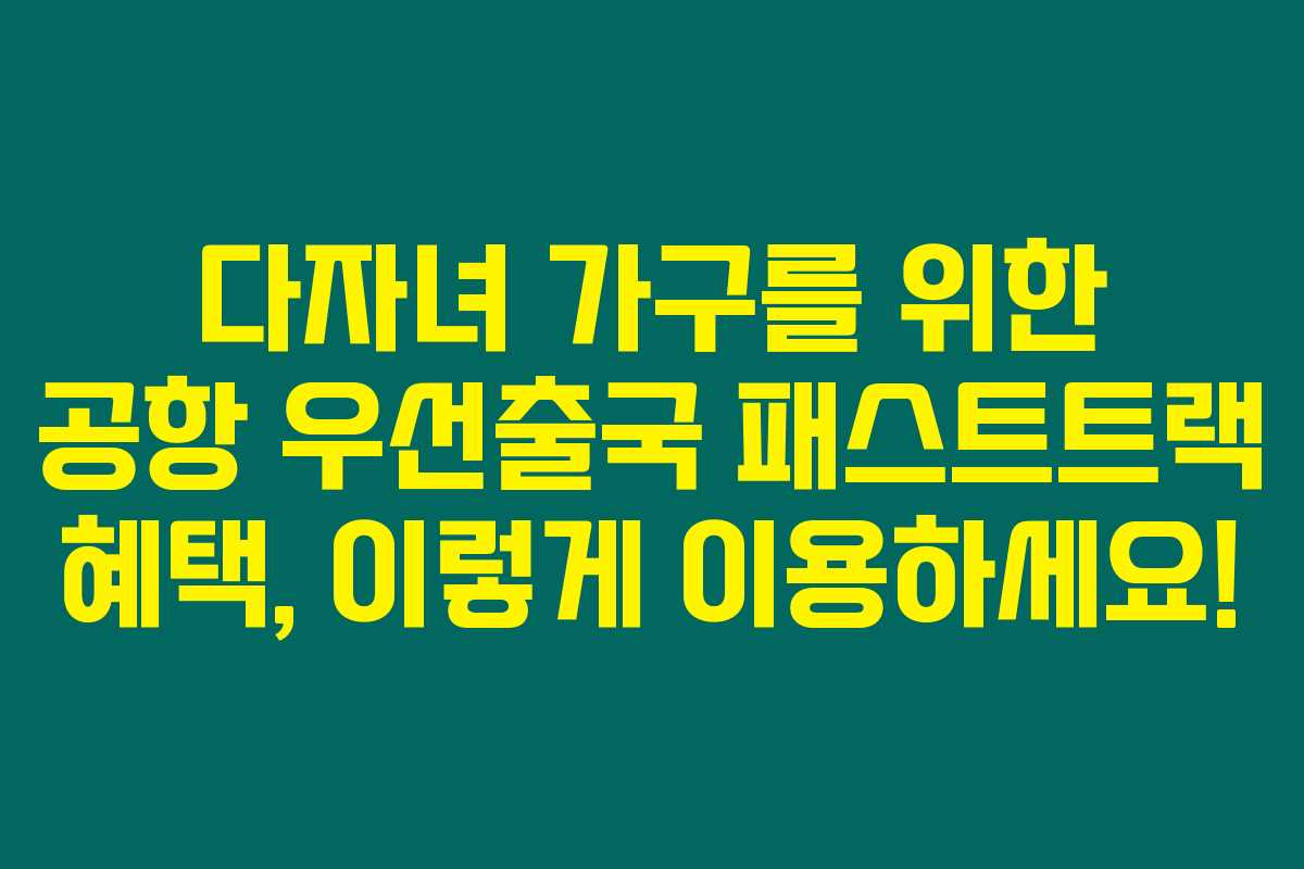 제가 직접 체크해본 바로는 다자녀 가구를 위한 공항 우선출국 패스트트랙 혜택은 정말 소중한 서비스에요. 특히 3자녀 이상 키우시는 분들에게는 공항 이용이 어렵고 힘든 일이 많았던 경험이 있으실 텐데요. 패스트트랙을 활용하면 출국 과정에서도 많은 시간을 절약할 수 있어 가족 여행을 보다 쾌적하게 만들어 줄 수 있답니다. 아래를 읽어보시면 다자녀 가구가 누릴 수 있는 우대 혜택과 이용 방법, 유의사항에 대해 자세히 알아보실 수 있습니다.