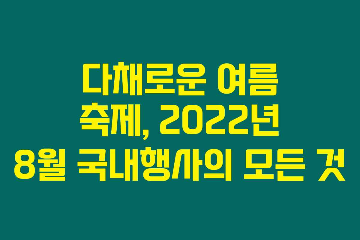 풍성한 축제들이 기다리고 있는 2022년 8월, 각 지역에서 열리는 행사들을 경험하면서 한국의 다양한 문화와 예술을 체험해 보세요. 지역의 특성과 매력을 담고 있는 각 축제는 분명히 독특한 추억을 선사할 것입니다.
