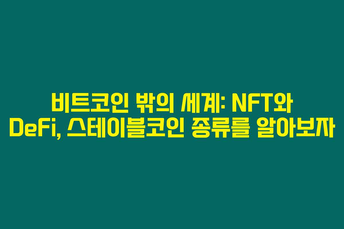 제가 알아본 바로는, 비트코인 외에도 다양한 코인 종류가 존재하는데 특히 NFT코인, 디파이코인, 그리고 스테이블코인이 많은 주목을 받고 있습니다. 이들은 각기 다른 특성을 지니고 있으며, 블록체인 기술을 활용하여 새로운 금융 생태계를 형성하고 있습니다. 아래를 읽어보시면 이들 각각의 코인에 대한 깊이 있는 이해를 도와드릴 수 있을 거예요.