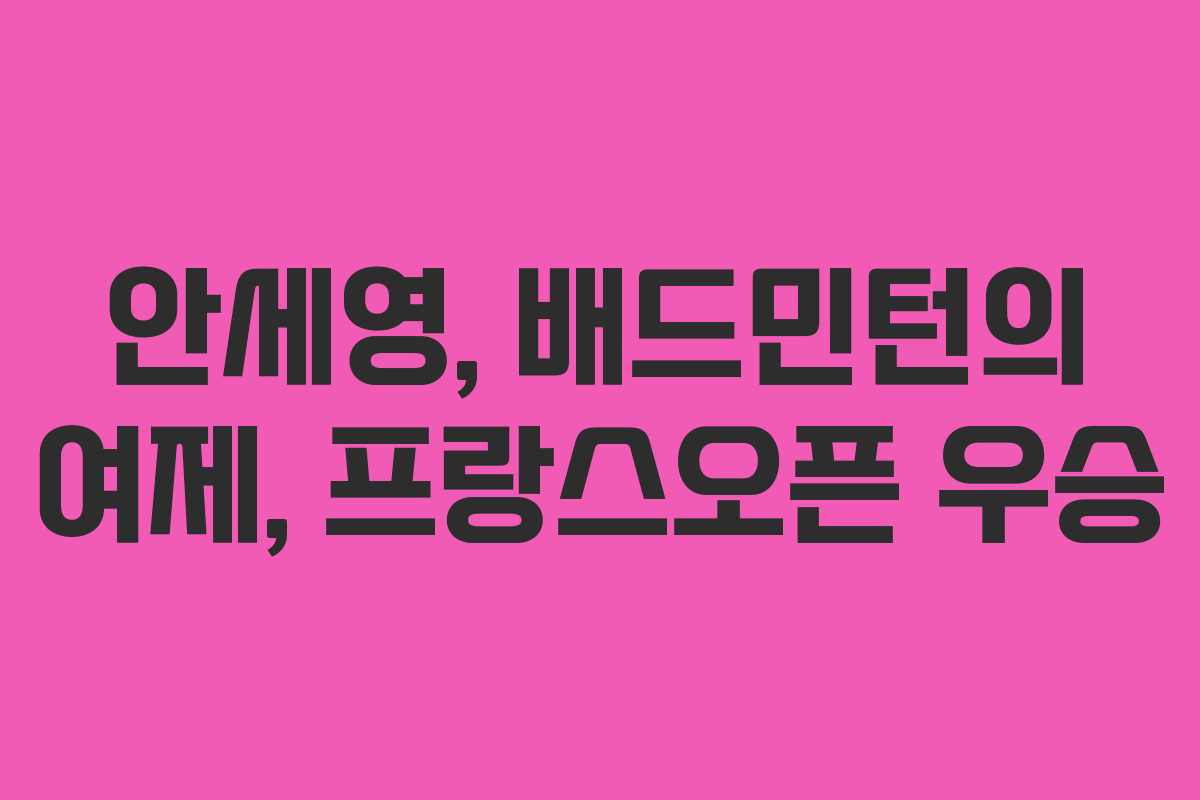 2025년 10월 26일, 프랑스 세송세비녜에서 열린 여자단식 결승전에서 세계랭킹 1위 안세영은 2위 왕즈이(중국)와 맞붙었습니다. 안세영은 단 한 순간도 주도권을 내주지 않고 2-0(21-13, 21-7)으로 승리하며, 42분 만에 결승전을 마쳤습니다.