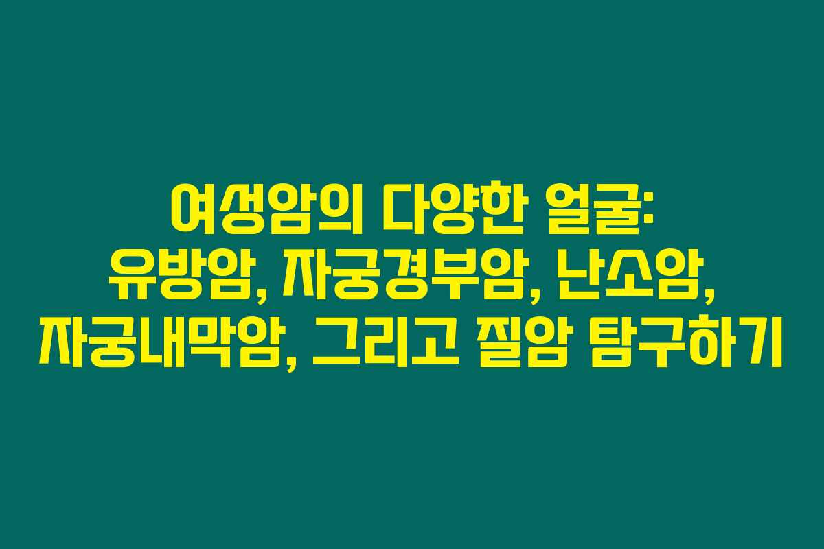 여성의 건강을 지키기 위해서는 암에 대한 올바른 정보와 정기적인 검진이 필수적입니다. 각 여성암의 종류와 증상을 알고 있으면 조기 발견이 가능하고, 이는 곧 치료 성과로 이어질 수 있습니다. 아래를 읽어보시면 유방암, 자궁경부암, 난소암, 자궁내막암, 질암에 대한 자세한 정보를 확인할 수 있습니다.