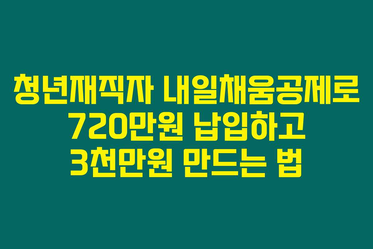 제가 직접 알아본 바로는 청년재직자 내일채움공제는 청년들에게 제공되는 아주 매력적인 저축 제도입니다. 이 제도는 소정의 금액을 납입하는 것만으로도 큰 혜택을 받을 수 있는 기회를 제공합니다. 제가 체크해본 바로는, 720만원을 5년간 납입하면 만기 시 3천만원의 큰 목돈을 받을 수 있습니다. 아래를 읽어보시면 청년재직자 내일채움공제의 모든 세부정보와 활용 방법에 대해 알아보실 수 있습니다.