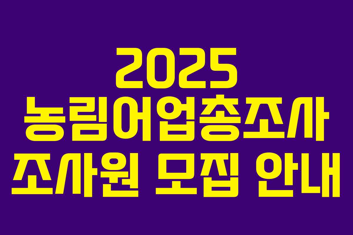 2025년 농림어업총조사 조사원 모집이 시작되었습니다. 만 18세 이상의 누구나 신청할 수 있으며, 모집 기간, 지원 자격, 근무 기간, 보수 등 다양한 정보를 제공합니다. 현장조사에 참여하고 싶으신 분들은 지금 바로 지원하시기 바랍니다.